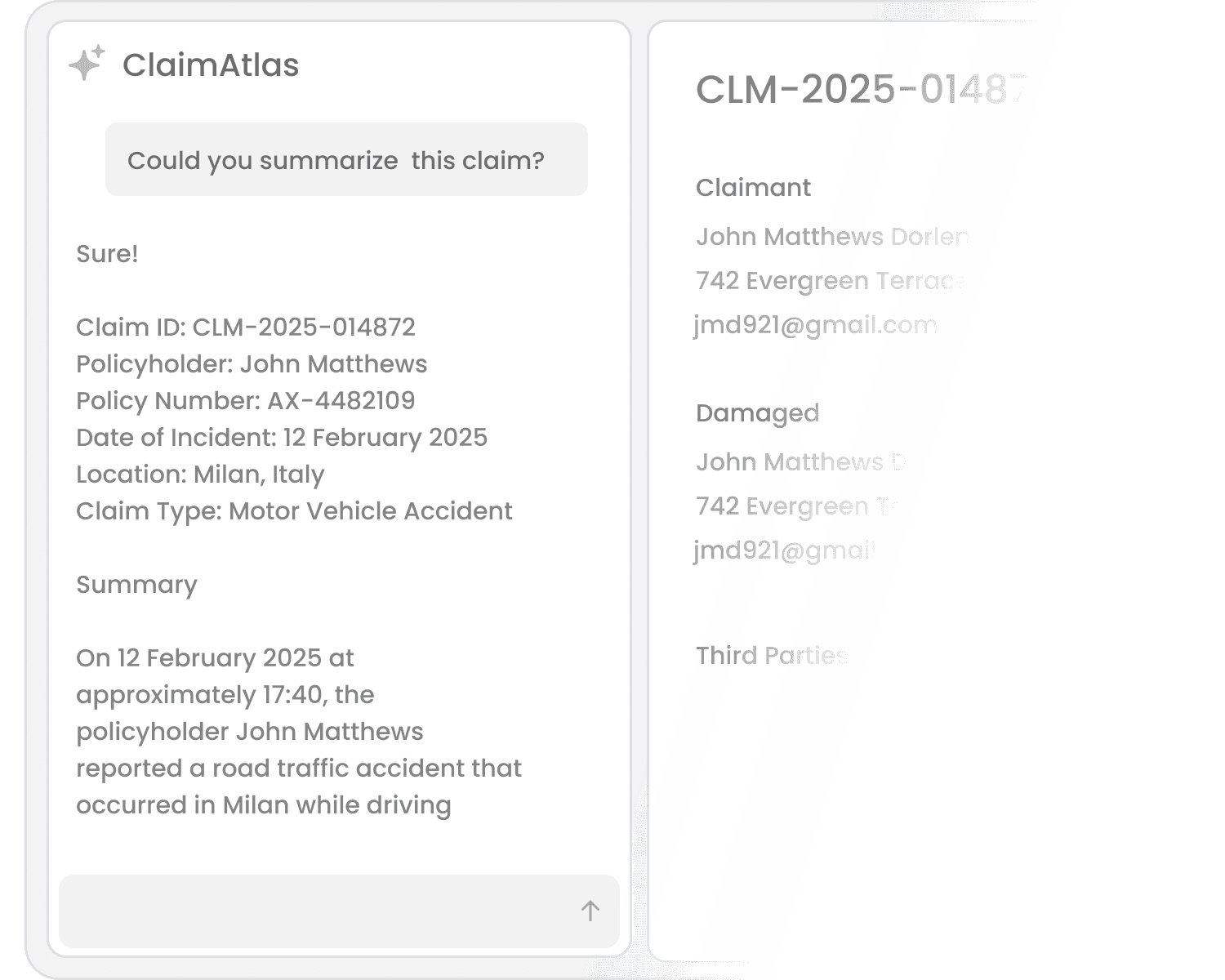 Each claim is indexed, allowing all data to be queried in natural language. A local LLM searches vectorized representations of your data and enables features such as summarization, automatic translation, and real-time policy cross-checking.