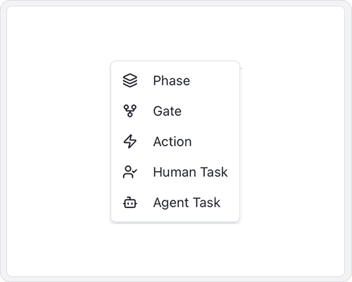 Not only standard actions like gates and human tasks, but also a collection of pre-built Catalog Tasks (such as SMS notifications, WhatsApp, Slack, and Teams), along with a fully customizable agent task to design the perfect agentic pipeline for your specific workflow.a